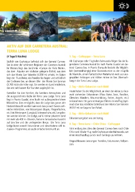 clusive» Programme, als auch einfache Unterkunft an. Fahrt entlang des Ufers des General Carrera-Sees nach Chile