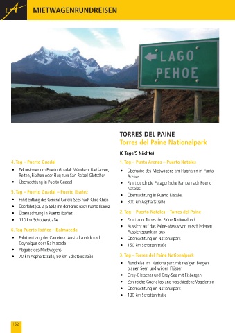 • 70 km Asphaltstraße, 50 km Schotterstraße 3. Tag – Torres del Paine Nationalpark