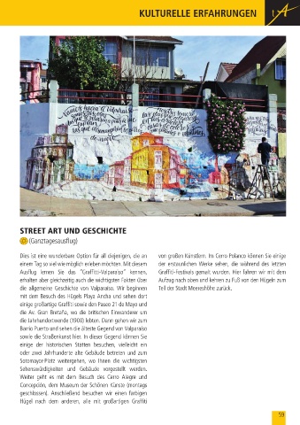 Ausflug lernen Sie das “Graffitti-Valparaïso“ kennen, Graffiti-Festivals gemalt wurden. Hier fahren wir mit dem